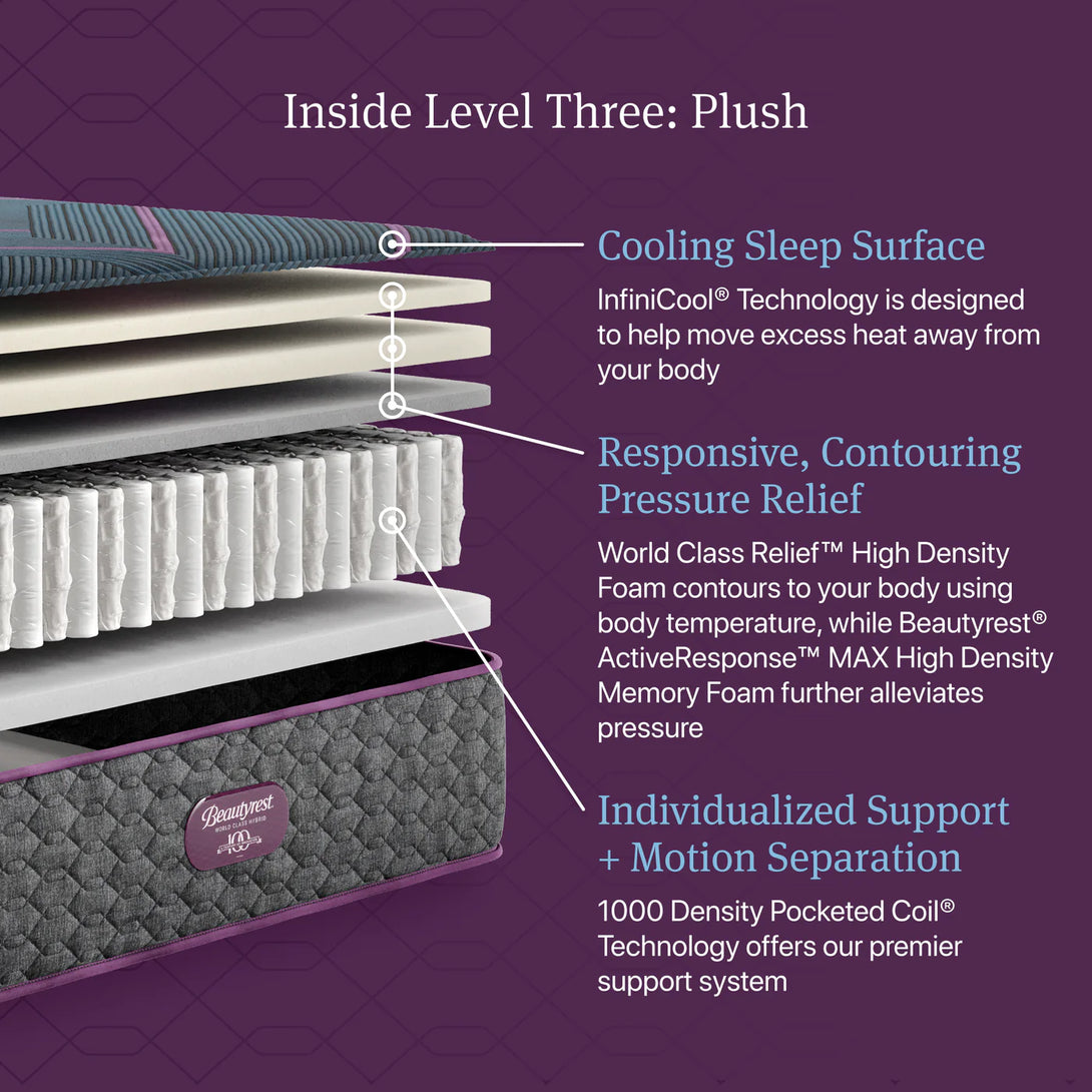 Step up to a world-class sleep experience with the Beautyrest Level Three 13" Plush Hybrid Mattress. Designed for those who crave a balance of softness and support, this mattress combines advanced coil technology, contouring comfort, and cooling innovation for a truly luxurious night’s rest.